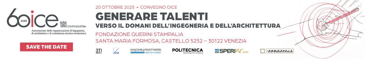 Si svolgerà a Venezia lunedì 20 ottobre 2025 (presso l'auditorium della Fondazione Querini Stampalia, Santa Maria Formosa, Castello 5252, ore 10-13) il secondo Convegno celebrativo del 60ennale della nostra Associazione dal titolo: "Generare talenti: verso il domani dell'ingegneria e dell'architettura", un evento realizzato nell'ambito del Padiglione Italia (sponsorizzato da OICE) alla Biennale Architettura 2025, promosso dalla Direzione Generale Creatività Contemporanea del Ministero della Cultura e curato da Guendalina Salimei con il progetto "TERRAE AQUAE. L'Italia e L'intelligenza del Mare".